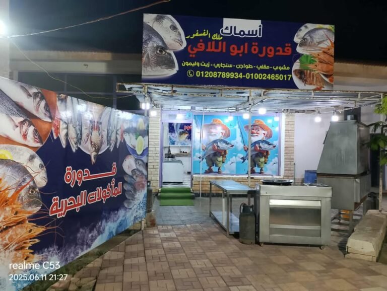 فإذا كنت تبحث عن الطعم المميز، والنظافة، والسعر المناسب، والجو العائلي الهادئ — فلا تتردد في زيارة أسماك قدّوره أبو اللافي في سيدي حنيش – أمام قرية باغوش – بجوار مزلقان القطار، حيث الطعم يحكي قصة البحر بكل تفاصيلها.