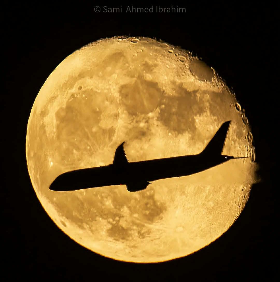 إحدى هذه الصور المميزة التقطها سامي في سماء القاهرة بتاريخ 23 أغسطس 2023، حيث يظهر القمر العملاق محاطاً بجو المدينة، وتمر أمامه طائرة بكامل محيطها، وهو مشهد يعتبر من الصور النادرة على مستوى الو