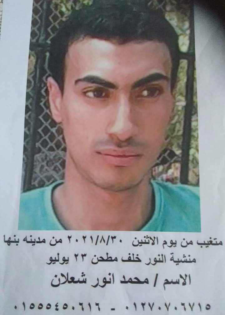 خرج الشاب محمد أنور شعلان من منزله بمدينة بنها – القليوبية يوم الإثنين الموافق 30/8/2021، بدون بطاقة شخصية أو هاتف محمول، ومنذ ذلك اليوم لم يتم العثور عليه رغم البحث المستمر في جميع محافظات الجمهورية وزيارة المستشفيات وأقسام الشرطة دون جدوى.